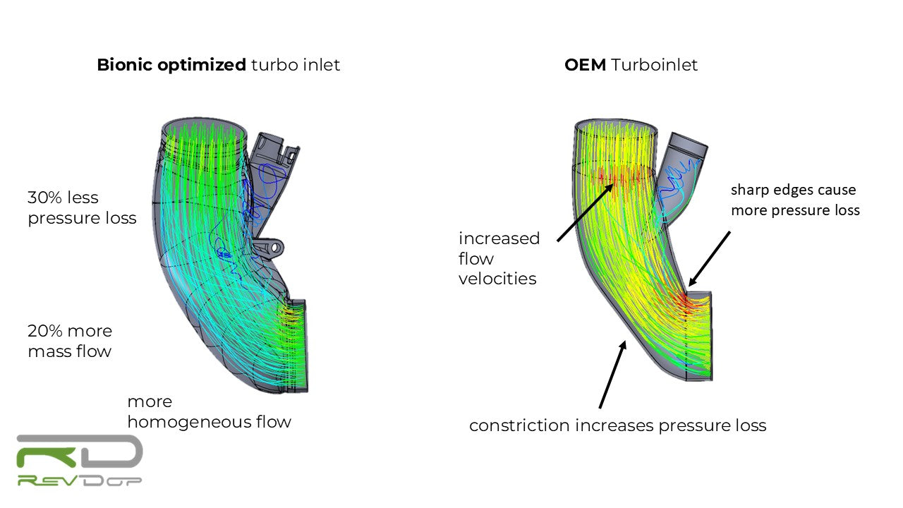 Experience the benefits of a bionically optimized turbo inlet and transform your driving experience. Increase your vehicle's performance and enjoy the benefits of improved throttle response. Take the next step toward a more efficient and powerful drive – with our innovative, bionic turbo inlet.
